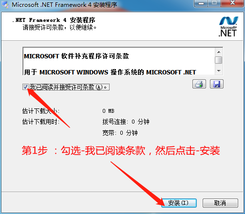 Step 1: Check the box - I have read and accepted the license terms, click - Install