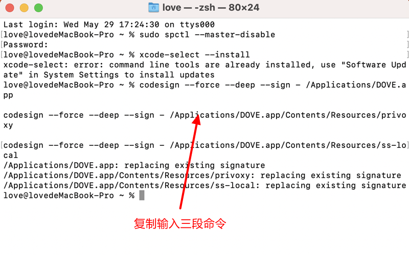 第6步:安装完成后,再次回到终端里,复制输入三行签名命令: