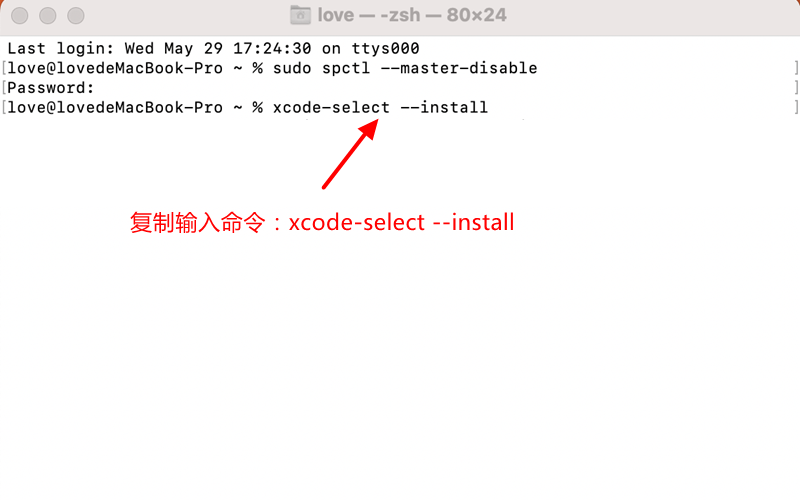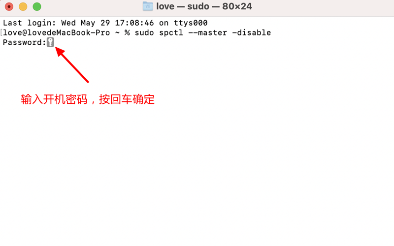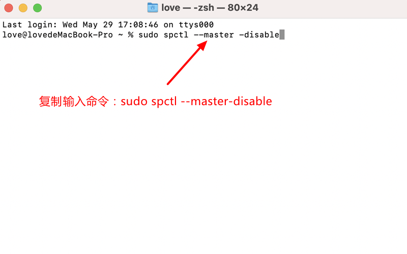 第2步:打开终端后,在终端程序里复制输入命令:sudo spctl --master-disable